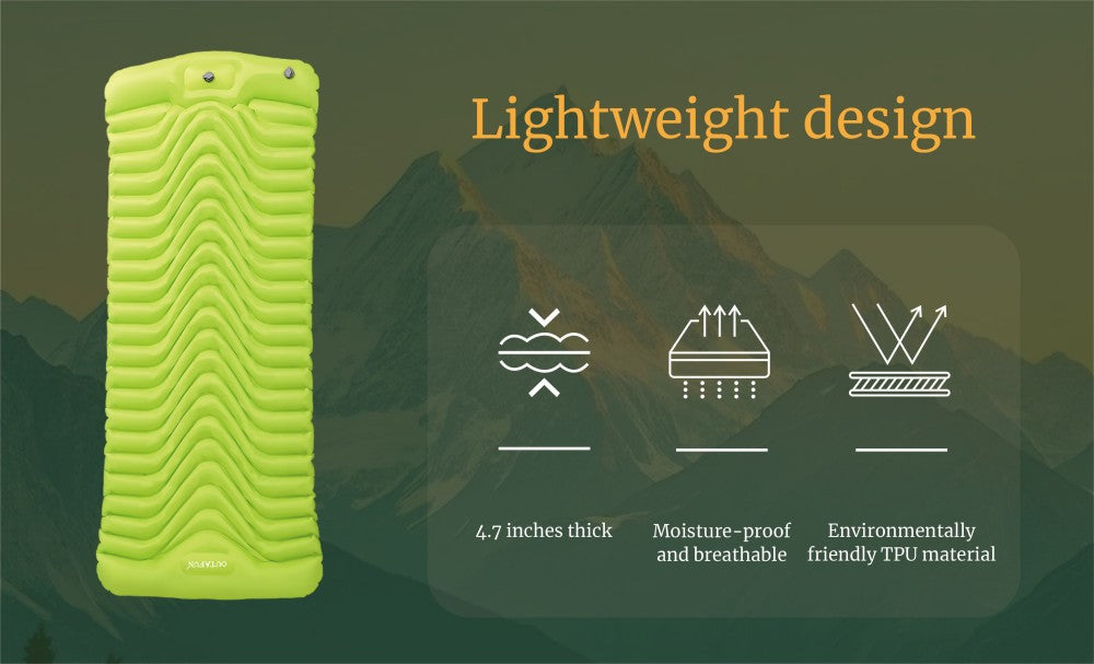 This lightweight air sleeping mat is designed for portable outdoor camping and leisure activities, featuring water-resistant and moisture-proof properties. The eco-friendly TPU material is key to its lightweight design.